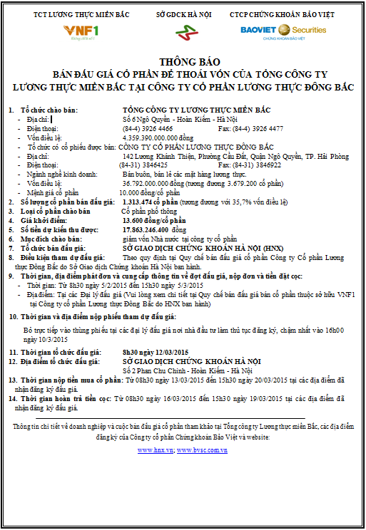 Thông báo bán đấu giá cổ phần để thoái vốn của Tổng công ty lương thực miền Bắc tại Công ty Cổ phần Lương thực Đông Bắc