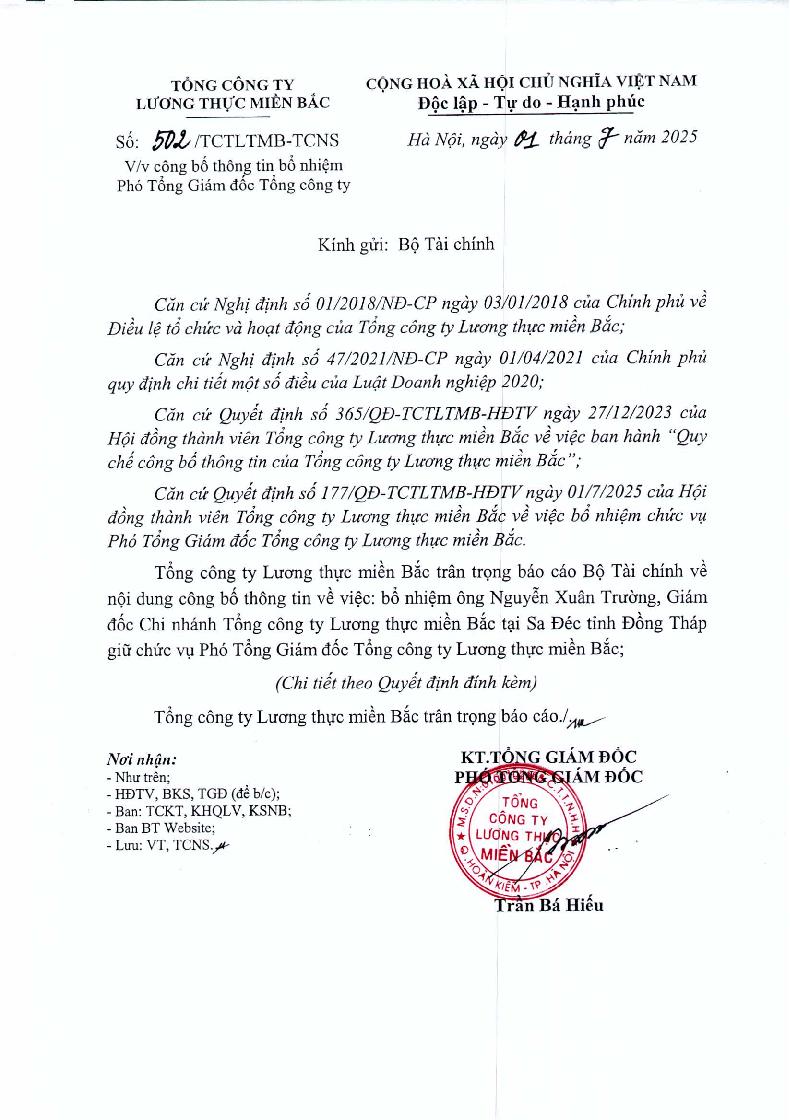 TCTLTMB: 502/TCTLTMB-TCNS ngày 01/07/2025 V/v công bố thông tin bổ nhiệm Phó Tổng Giám đốc Tổng công ty - Nguyễn Xuân Trường